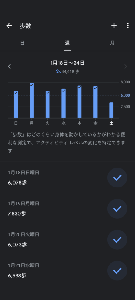 先週は外出が重なり、1週間を通して毎日外に出たため、歩数がかなり伸びました。