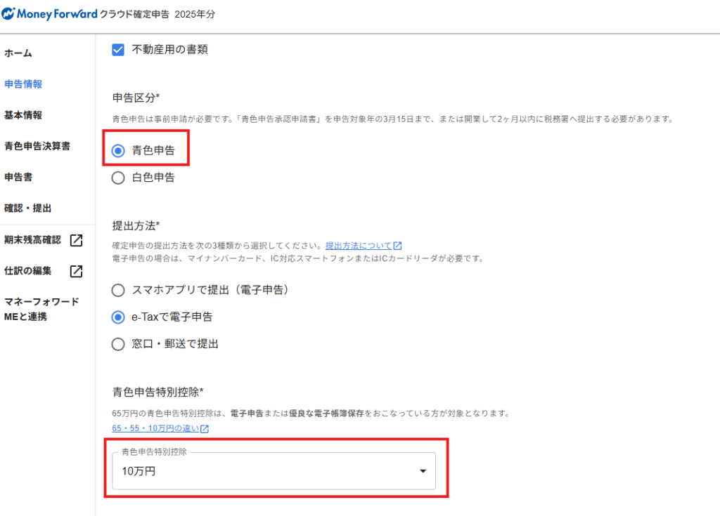 マネーフォワードの設定画面で「青色申告(10万円控除)」を選択し、2か所チェックを切り替えるだけ。これだけで、所得実際の設定変更は、チェックを切り替えるだけのわずか数秒の手間です。