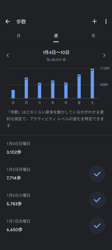 1週間の平均7千歩弱。2駅歩いた火曜より、半日労働の月曜の方が歩数が多いという不思議な現象もありましたが、やはり「外出」のパワーは絶大ですね。